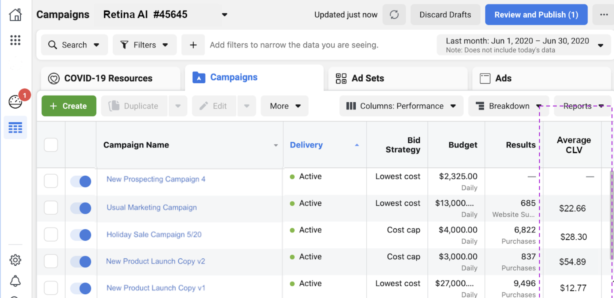 If you share order-level data with Facebook, you can get more value by also including the expected lifetime value of the customer. CLV can appear as an additional column within Facebook ads manager.